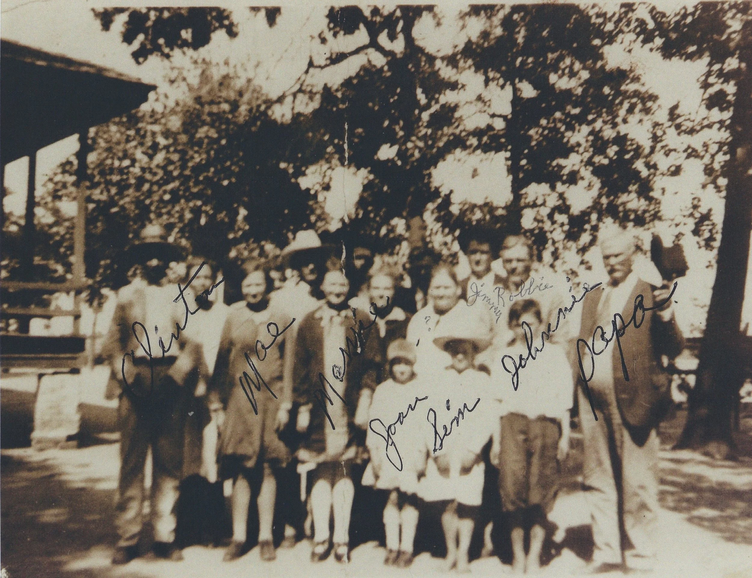 This picture was taken at the home of Joseph Harmon Chavis on his birthday, April 20th in 1931 or 1932. According to Joan McClure, Joseph nailed lumber to the trees to have a place for the food. There was a lot of people and many baskets of food.